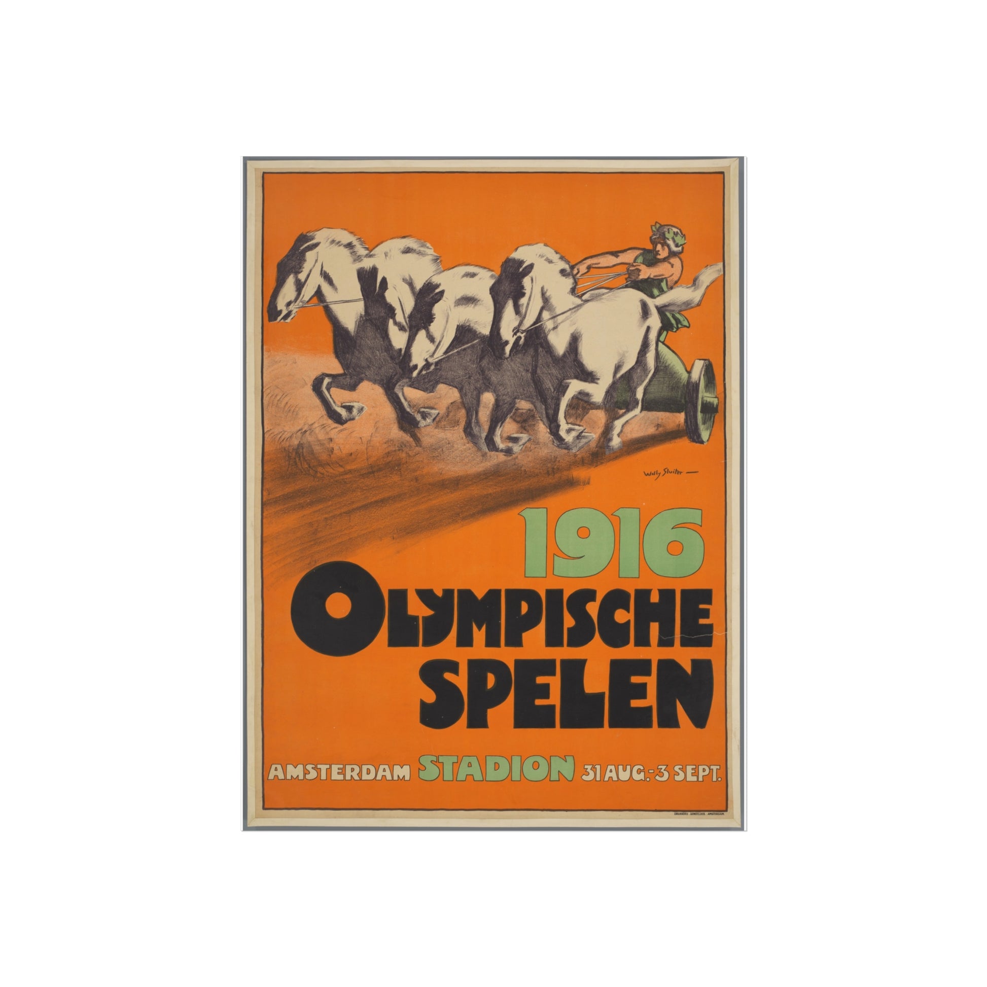 This vintage design was done by Dutch artist Willy Sluiter, was created in anticipation of the 1916 Olympic Games, which were scheduled to be held in Amsterdam before cancellation due to World War I. The poster captures the energy of early 20th-century European travel and sport, featuring Amsterdam's central station as a hub of international excitement. Sluiter, known for his vibrant style and contribution to Dutch poster art, combines strong architectural detail with the bold language of Olympic promotional materials. Today, this piece serves as optimism and cultural ambition before the onset of the first world war.