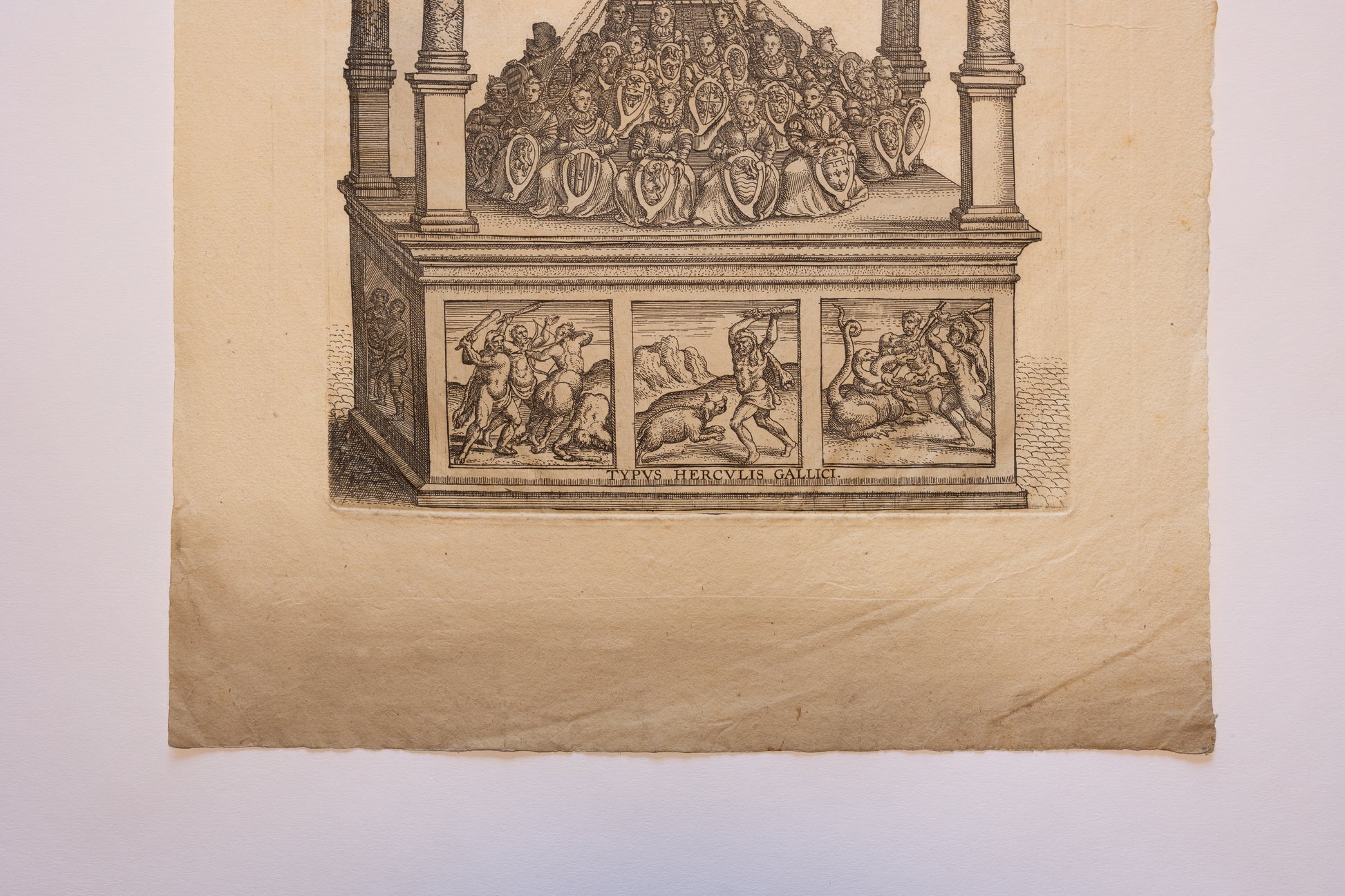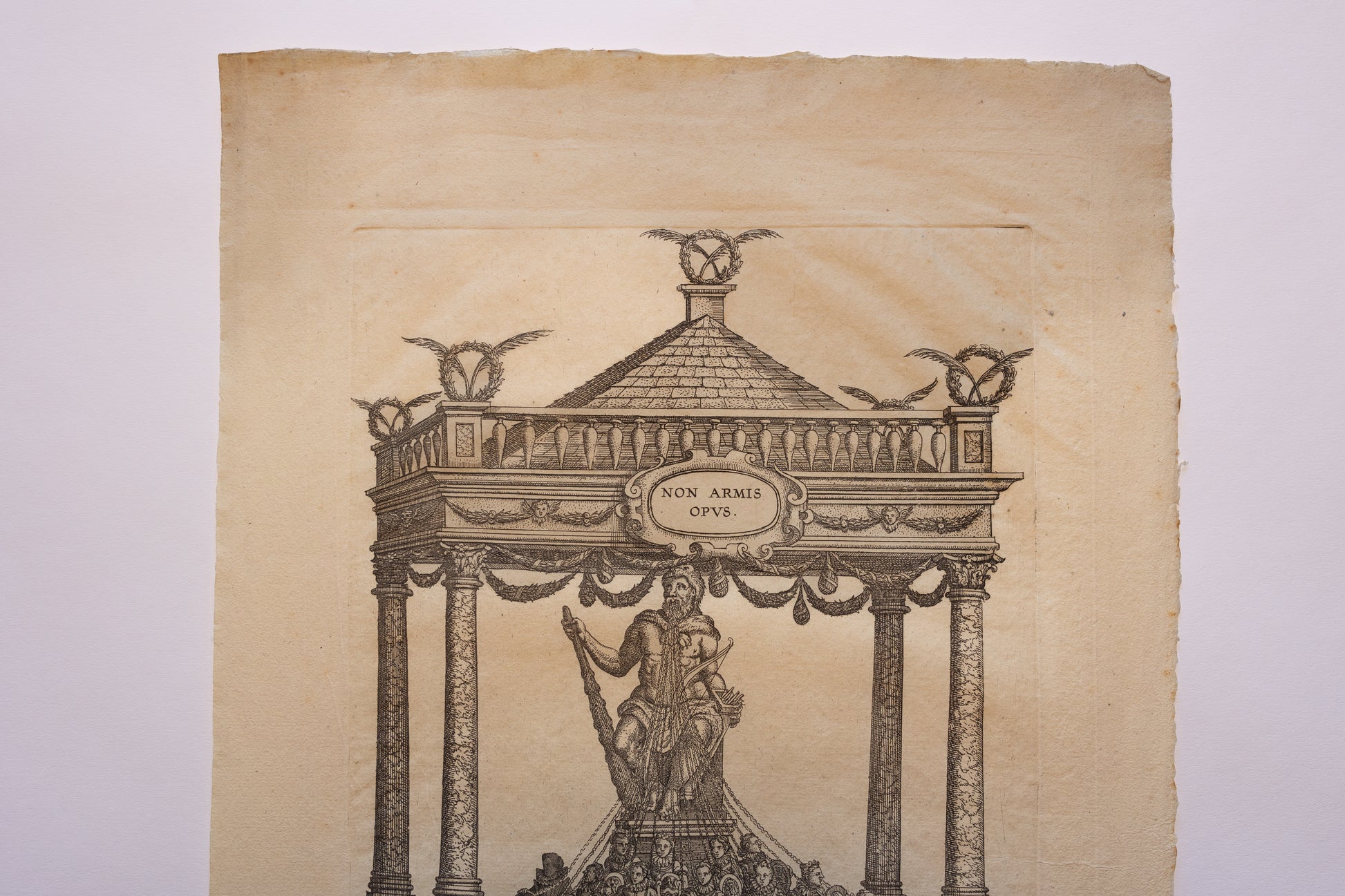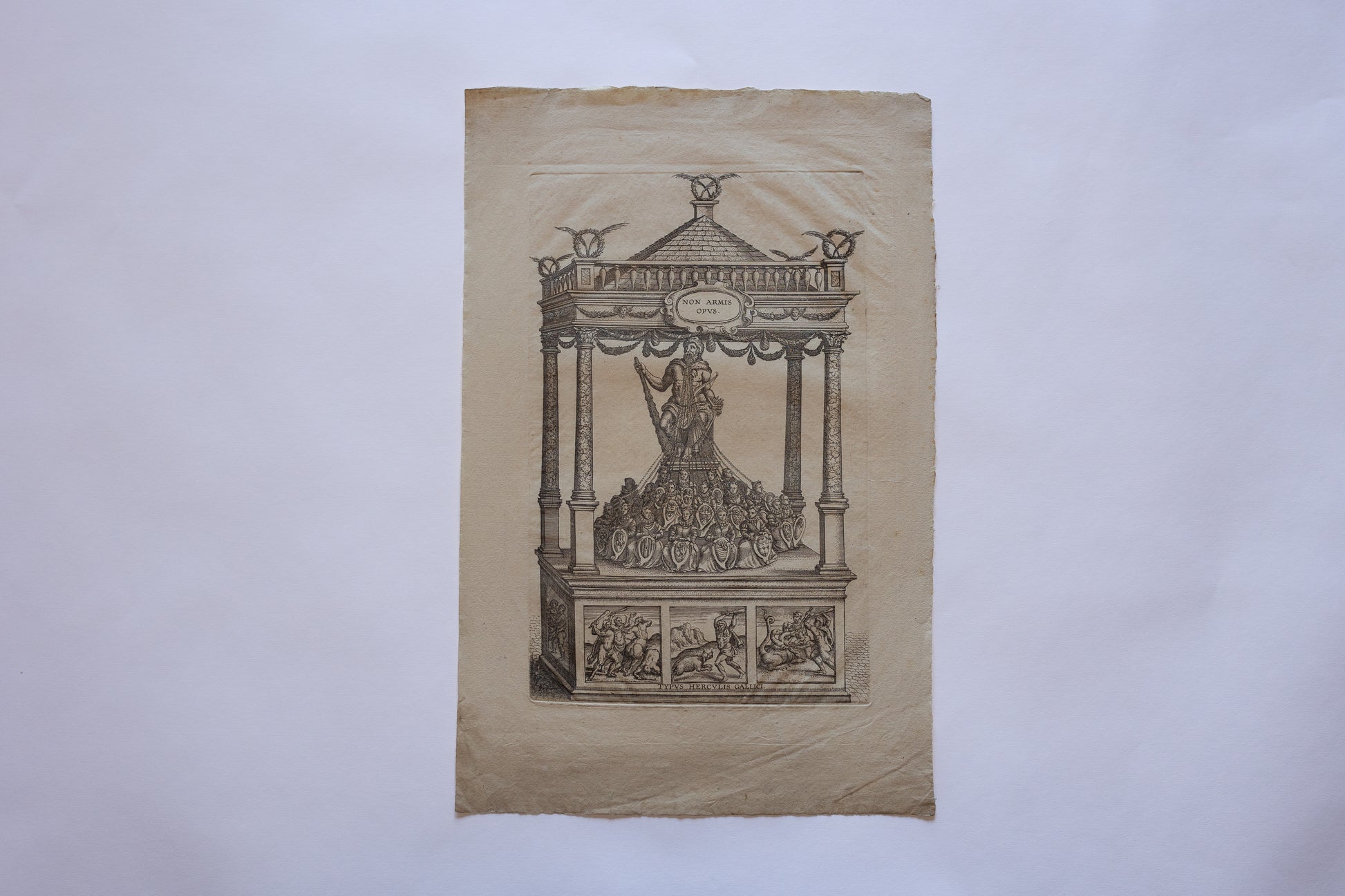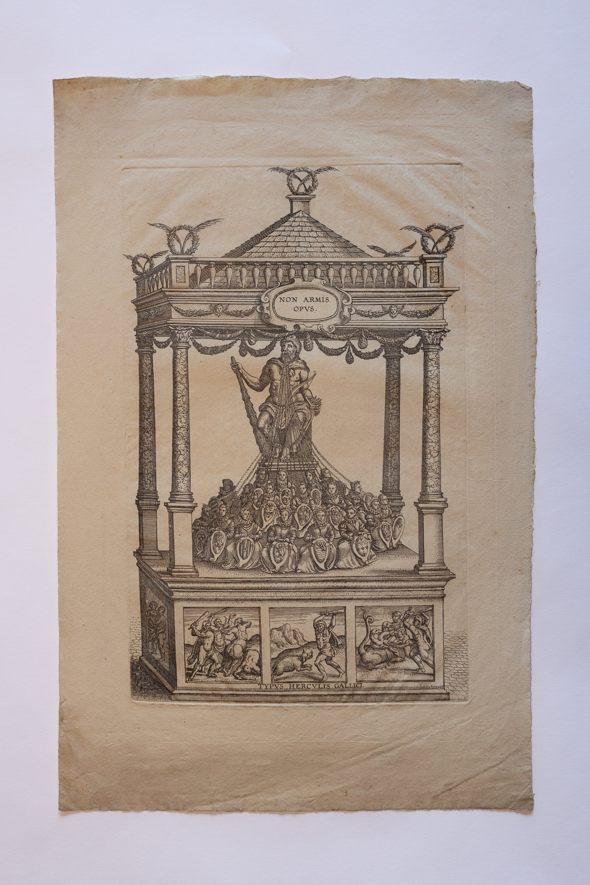 "Typus Herculis Gallici" (c. late 16th to early 17th century) By Pieter Van Der Borcht. For sale is a rare allegorical engraving depicting the Gallic Hercules as a figure of peace and leadership. The Latin motto “Non Armis Opus” suggests a rejection of violence in favor of diplomacy or civic unity. Classical in style, the print is framed by an architectural canopy and filled with Renaissance iconography, This is truly a remarkable example of early modern political and moral allegory in art, and incredibly rare. No known examples have been sold in recent history.